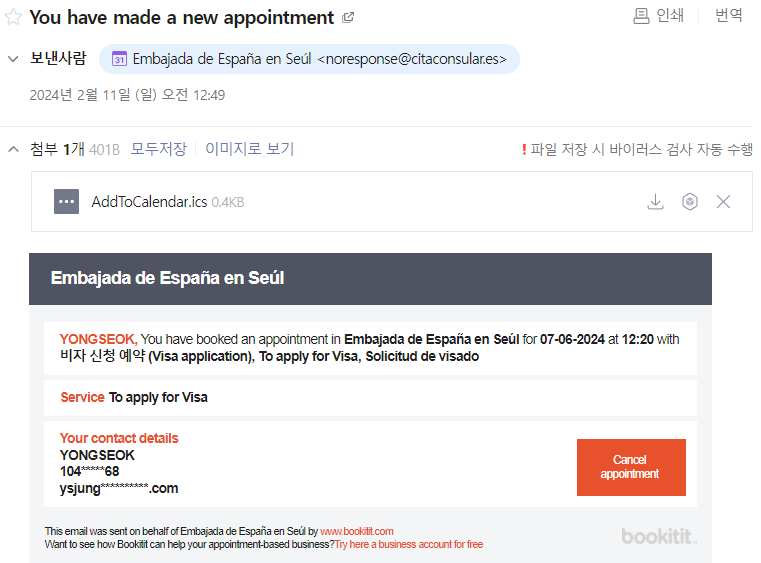 비자 예약을 하면 3일 이전에 Confirm your attendance 메일이 오는데